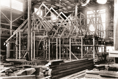Reisverket for kirken fotografert i fabrikkens monteringshall før elementene ble merket og demontert for skipning til Sør-Georgia. I boken Hvalfangerkirken heter det: Materialene til kirken var vel tilrettelagt av Strømmen Trævarefabrik, etter en uke var reisverket oppe.