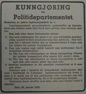 I oktober 1941 tok sjefen for det tyske sikkerhetspoliti i Norge, Heinrich Fehlis initiativ til stempling av legitimasjonspapirene til de norske jødene med en to cm høy rød «J». Dette var et tiltak som Tyskland hadde gjennomført for sine egne borgere allerede i 1938. Også tyske immigranter som oppholdt seg i Norge før krigen måtte på den tyske legasjonen i Drammensveien 74 for å få et slikt stempel. De norske NS-myndighetene fant det derfor naturlig at det samme ble gjort gjeldende i det okkuperte Norge, og utad framsto at dette som et norsk tiltak.