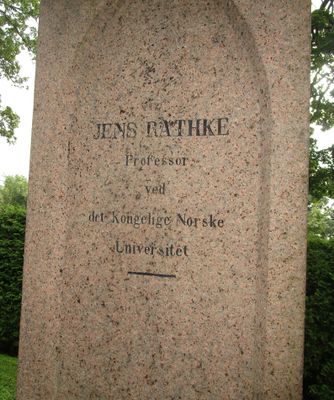 Jens Rathke er gravlagt på Vår Frelsers gravlund i Oslo. Gravminnet, en bauta, har påskriften Professor ved det Kongelige Norske Universitet.