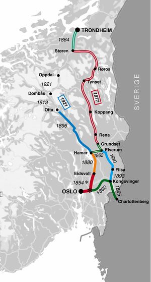 | Blå | 1896 | Hamar-Selbanen åpnet til Otta | Normalspor | Hamar-Selbanen |