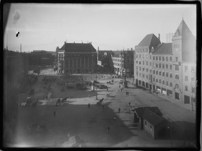 - Jernbanetorget før 1916. Det lave huset i midten er nr. 2, som er erstatta av Den Norske Amerikalinjes bygning.Foto: Narve Skarpmoen (1900–1916).