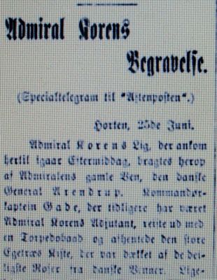 | Begravelsen, der fandt sted kl. 2 ½ idag fra Hortens kapel, var meget høitidelig. Foran kirkegaarden var reist flagstænger med store marineflag paa halv stang. Kapellet var pyntet med levende vexter, og flag paa halv stang var reist udenfor. Blandt de tilstedeværende saaes fhv. statsminister Løvenskiold og de forhenværende statsraader Thorne og høiesteretsassessor Reimers, en række høiere sjøoffiserer og flere af avdødes gamle venner fra Horten, Kristiania og Moss, samt familien. | ||