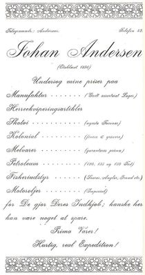 Johan Andersen startet sin butikk i sentrum av Harstad i 1890 etter flere år som medhjelper og ekspeditør i kjøpmann Giævers butikk. Vi vet ikke helt nøyaktig når Andersen startet som handelsmann. I nekrologen som sto på trykk i Harstad Tidende 6. januar 1949 sies det at han startet opp i 1890. Men i en annonse fra katalogen til Harstadutstillingen 1911 finner vi at han etablerte seg i 1896. Av en stor to-spalters annonse i Harstad Tidende for 8. juni 1905 ser vi at han solgte «alle Varer til absolutt billigste Priser – under «Handelsstevnet». Sortimentet varierte da fra «Pigtraad og Slettraad, via «Prima Melvarer» til «Skotøi, Hatte og Huer». Med andre ord; som en god gammel landhandel. Før jul i 1910 annonserte han for «Juleindkjøb» i sin «velassorterte manufaktur-, kolonial og kortevareforretning», også da over to spalter.