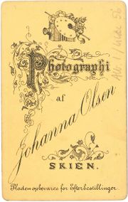 | Johanna Olsen (1850–1929) er basert på data fra Preus Museums registre over norske fotografer og fotografiske samlinger, som er tilgjengelig på Nasjonalbibliotekets nettsider. Artikkelen er lagt ut under lisensen cc-by-sa. Lokalhistoriewikis brukere kan fritt redigere og utvide artikkelen. Flere artikler finnes i denne alfabetiske oversikten. |