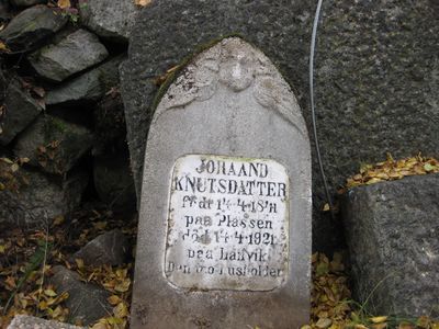 - «Joraand Knutsdatter f. 14 04 1841 og d. 14 04 1921».