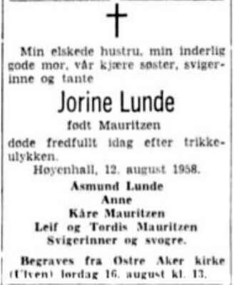 Jorine ble gift med Aasmund Lunde (1908-1990), og de bosatte seg på Hellerud. Østensjøbanen var et praktisk framkomstmiddel, og dessverre for Jorine tok hun trikken på formiddagen den 2. august 1958. En elektrisk feil førte til at det brøt ut brann, og flere av dørene lot seg ikke åpne. Det var fem dødsofre i brannen, fire døde samme dag, mens Jorine Lunde døde på sykehus 10 dager senere.