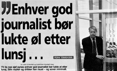 | Skarp observasjonsevne og glitrende form. Klare meninger og raus væremåte. Slentrende lederstil og ufravikelige journalistiske krav. Gullpenn og nyhetsjeger. Provokatør og imperiebygger. Kunstelsker og bilentusiast. Slik trer Kåre Valebrokk frem fra stikkordenes fragmenterte virkelighetsbilde. Nå er han borte, og de nærmeste dagene vil det bli fortalt et vell av historier om denne milde sørlendingen med brodd i det han foretok seg. Han som tidlig i sin lange redaktørtid ble elsket av sine medarbeidere for spissformuleringer om at journalister burde lukte øl etter lunsj. ... Kåre Valebrokk hadde begrenset tro på skrivebordsjournalistikkens kontaktskapende evne. Han ivret for en journalistikk som sto i friksjonsfylt tannhjulstilling til resten av samfunnet. | ||