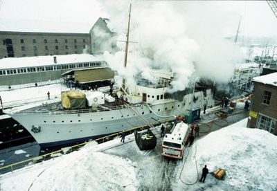 I dokka lå et sørgelig syn. Kongeskipet som nesten var ferdig etter fem måneder med arbeider ombord og som etter planen skulle forlatt Horten noen dager seinere, lå totalt utbrent. Midtskips var nesten alt som kunne brenne, brent.