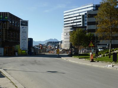 Søndre del av Kaigata var et uoversiktlig skue i 2017, hovedsakelig pga. byggingen av den nye havneterminalen. Kaigata 6, hotellet The Edge, rager i bakgrunnen.