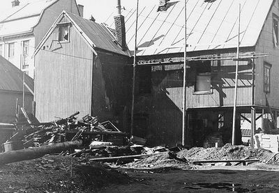Det var ei stor brygge som hørte til Kaigata 5. I våre dager er huset modernisert og huser skatteetatene i byen. 1958.