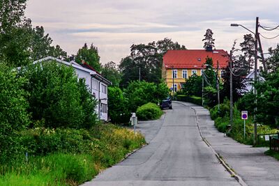 Kapellveien sett sørover. I bakgrunnen ser vi Kolbotn gamle middelskole.