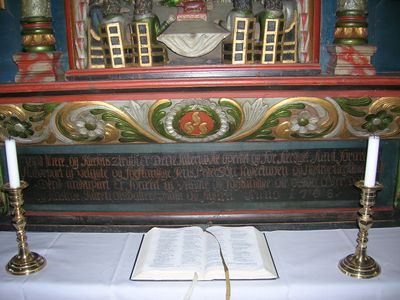 - Gud til ære og Kierkens zirath Er Dene Altertavle oprettet og for færdiget samt foræret den