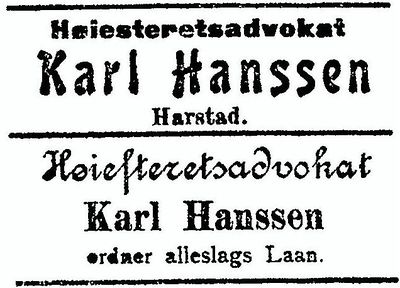 Annonse for Karl A. Hanssens advokatpraksis i Harstad Tidende mandag 20. februar 1905.