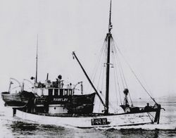 Karlot Mikalsens båt Ramfløy kan være oppkalt etter RamfløyaGamnes. Her er hun godt lastet på vei til Harstadhamn for levering.