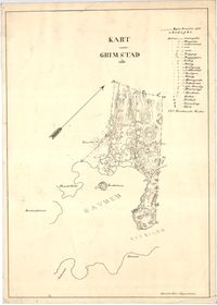 Dette "Vej-Kart over Det 2det Nedenæske Compagnie" er tegnet med kompanisjef M. Kuur som ansvarlig. Vi finner det lille ladestedet skravert rødt og vi finner veier mot nordvest til Kryssen der veien går videre mot Landvik/Lillesand, mot Rorevannet og mot Fjære. Og vi finner veien mot nordøst, over Bie mot Fjære kirke. Omkring Grimstad ligger også gårdene som gav byen plass; Skaregrøm, Berge og Bie.