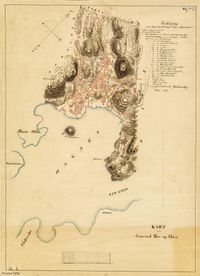 Bykart over Grimstad fra 1847. Foto: Riksarkivet.[1] Knut Brautaset har, i Grimstad adressetidende 15/8 2019, analysert kartet og begrunnet hvorfor årstallet 1856 i nedre hjørne må være påført senere.