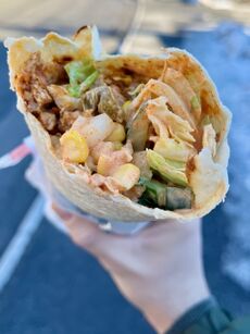En kyllingkebab slik den vanligvis serveres på Østlandet: I pitabrød med salat, grønnsaker og saus.