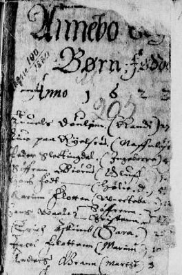 Utsnitt av den første siden av Andebus og Norges eldste kirkebok. Utsnittet viser døpte i Andebu sogn 1623. Siden er noe skadet i kantene. Fra Arkivverket, skannede kirkebøker.