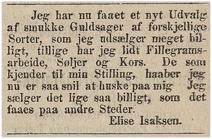 I 1900 drev Elisabeth Isaksen gullsmedforretning. Hun og to barn samt gullsmedsvend bodde i et hus i Østregate 34. [[8]]