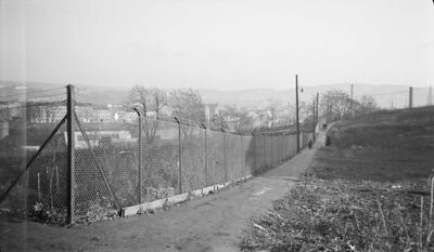 Kjærlighetsstien sett sørover med Egebergløkka parsellhage bak gjerdet til venstre.