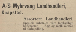 På den tiden var det vanlig at butikker tok imot egg direkte fra produsenter. Slik var det også på Myrvang. I lokalavisen kunne en lese den 10. juni 1932 at Myhrvang Landhandleri ønsket seg: «Egg mottas i varebytte til høieste dagspris. Myhrvang Landhandleri, Knapstad st.» [19]