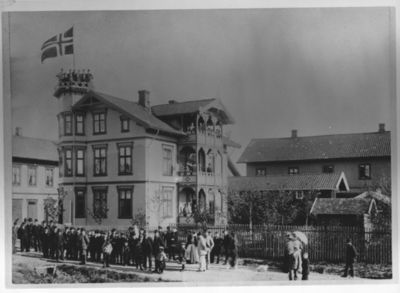 17.- maifeiring i Lillestrøm i 1890. Flagget er uten sildesalat (unionsmerke). Hornmusikkorkesteret som står i tårnet i Paulsen-gården i Solheimsgata 1, er trolig Musikkforeningen Concordias Hornblåserforening som ble stiftet i 1881.