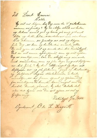 Det originale brevet, som tilhører Garverimuseet, Volda bygdetun.