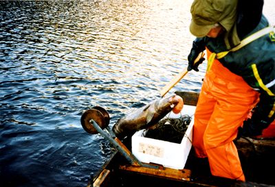Då fann me ut at me kunde ta framtakarnota (orkastnota). Det var den me bruka å ta silda ut or stengenota med, når me skulde levere sild. Den brukte me då til å stenge det som stod inne på instevika, for det var ein mindre fangst, og so brukte me den stengenota som var der på det nye kastet som var mykje større. Stengenota vart heilt full.