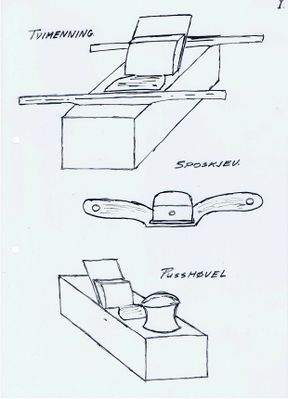 Pusshøvel: Har vel i dag fått avløysing av stålhøvel, men er likevel å sjå i dag og hos mange av dei som bygg båt. (Brukt til å "skjære yve" eit omfar og til klargjering av ytre kant på omfaret for neste omfar)