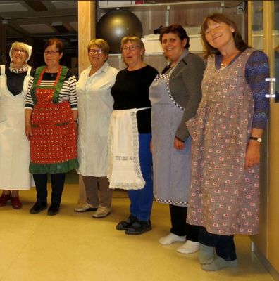 Mange syntest ikkje det var jul før juleforkledet kom på – som regel raudt med grøn pynt. Seinare med sølv- og gulltrådar. Marit har eit typisk juleforkle på gruppebiletet. Dette serveringsforkledet er det lagt mykje arbeid på, med nupereller innfelt i forkledet og rundt kanten.