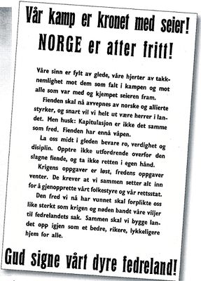 I løpet av noen dager ble hele tilværelsen vår forandret. Fra å være et okkupert folk i krig var nå alt snudd rundt, og vi kunne si, synge og gjøre ting som inntil nå hadde vært strengt forbudt. Flere av oss hørte for første gang «Norge i rødt, hvitt og blått», en sang som igjen og igjen ble sunget i disse dager sammen med «Seier’n er vår» som da gjaldt seieren over en farlig fiende, men som senere er blitt kampsangen ved mange idrettsbegivenheter.