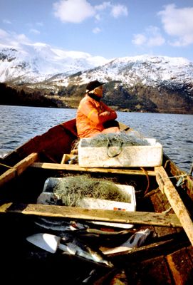 Frå den fyrste tida eg hugser og like til krigen, var far bas for notlaget. Den tida var fjorden ofte full av småsild, mussa kalla me den. Den var 12-15 cm lang og det var ingen restriksjonar på fangst. Som regel gjekk den til sildeolje/guano, men av og til ogso til hermetikk og det var sjølvsagt betre betalt. Når silda gjekk høgt i sjøen, var den å sjå som brune flak. Det kalla me bronkar. Dei viste best når det var sol. Når me var uppe på fjellet og gjætte, kunde me av og til sjå mange slike bronkar nede på fjorden. Men det var ein hake med det. Silda måtte vere nær land, elles kunde ein ikkje taka henne med nota. Når det var sild i fjorden hadde far atskillige turar inn på Rabben for å sjå etter bronkar. Det var liksom basen sin jobb å passe på slikt.
