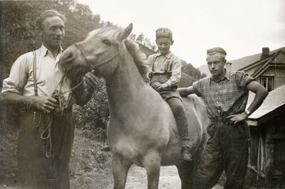 Hesten og eg vart gode kompisar i alt arbeid me var i lag om. Når eg tenkjer på den tida, var det i alle fall lærerikt. Om natta i slåtten gjekk hestane ut i «Stranda» – om morgonen når eg skulle hente hesten heldt han hovudet så høgt at eg ikkje skulle rekke å få grima på han. Me vart som oftast einige. Skal ikkje forbause meg om han flira litt for seg sjølv. Når me var komne gjennom ledet leidde eg han inntil øvste vegkanten så eg kom meg opp på ryggen og reid fram i tunet. Om ein hestesko var laus så gjorde ikkje hesten seg vanskeleg fordi om eg tok opp foten og stramma saumen. Hesten brydde seg heller ikkje om at eg framleis gjekk i folkeskulen. Litt undervisning hadde eg sikkert fått, som å snu saumen rett og passe på at saumen peika slik at den skulle koma ut der det var tenkt. Då fekk heller ikkje hesten vondt og han stod i ro. Når ein får det til så veks ein, i alle fall litt. At eg ikkje finn bilder frå hesten i arbeid er eit tankekors. Hesten me snakka om her var siste hesten på garden. Han reiste frå garden 31.08.1954. Då var eg og hesten 17 år. Eg kom aldri på å spørja etter hesten me hadde før. Eit søskenbarn, noko eldre en eg fortalde til meg at han hadde høyrt at hesten vår vart funnen daud ut i «Stranda», det var der hestane var på beite om natta i slåtten. Kva som var årsaka veit eg ikkje. Det er i alle fall heilt sikkert, eg har stilt for få spørsmål.