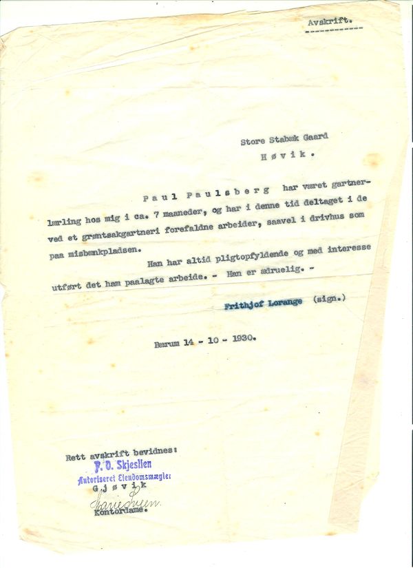 Paul Paulsbergs attester fra ulike gårds- og gartnerjobber på Østlandet 1928-1931, blant annet i Asker, Bærum og Eidsberg. Dette er jobber han hadde før han giftet seg og kjøpte bruket Paulsberg ved Gjøvik.