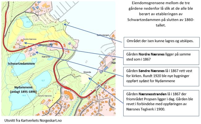 Damanlegget berørte den gangen 3 forskjellige eiendommer. Nordre Nærsnes, som ligger der den også lå i 1867. Gården Søndre Nærsnes som den gang hadde sine bygninger rett ovenfor kirken, rett ved Schwatrzedammen, der Institusjonen Breidablikk er i dag. Og det var Nærsnesstranden som lå nede på det som er Propsen i dag. Eiendomsgrensene mellom disse eiendommene den gangen, lå slik at alle ble berørt av damanlegget.