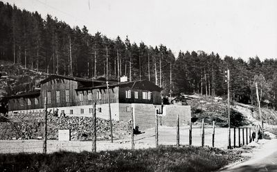 Riis gård til v., med stor antennebrakke øst for Skedsmo kirkevei. Med etableringen av tunge kommunikasjonssytemer forsterkes inntrykket av at tyskerne var i gang med å etablere ledelsen av det tyske luftforsvaret i Norge og Finland i Kjellers nærområde. Feltpostadressene bekrefter dette inntrykket.