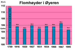 Denne grafen med Øyerens flomhøyder viser at Kjeller har slitt med flom flere ganger i sin levetid. Fotokilde Knut Kinne.