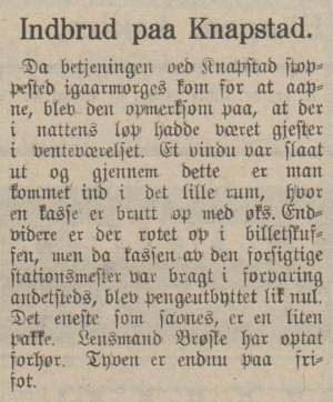 Innbrudd på Knapstad stasjon i 1914 - tyven ennu ikke funnet!