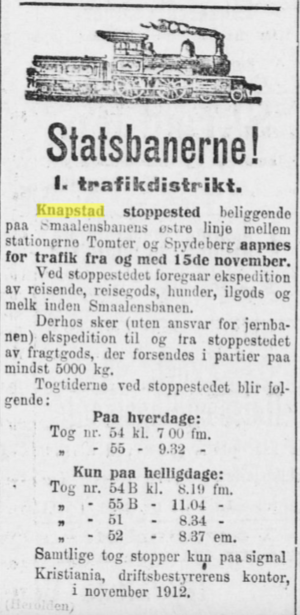Knapstad stoppested 1912 - togtider. "Samtlige tog stopper kun på signal"