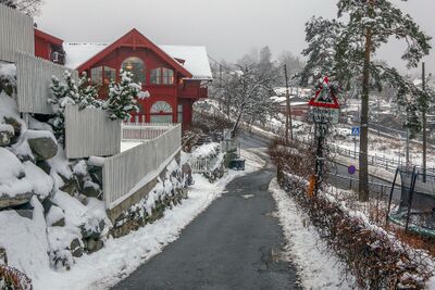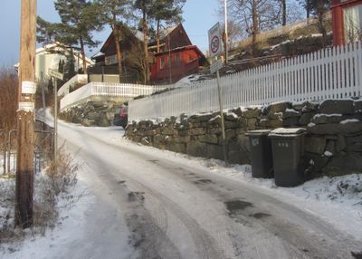 Parti fra veien Kneika. Det mørke huset bak furutrærne er nr. 1.