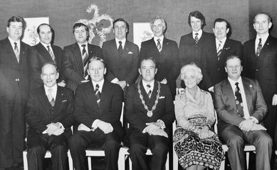 Harstad Formannskap 72-1975. Bak fra v.: Bjarne Ag, Arvid Knutsen, Ivar Hansen, Per kildal, Svein M. Klausen, Andreas Bergland, Asbjørn Johansen, Tom Veierød, Johan Nordvik. – Foran fra v.: Magnus Pettersen, Arnljot Norwich, Marit Schjelderup, Per Jacobsen
