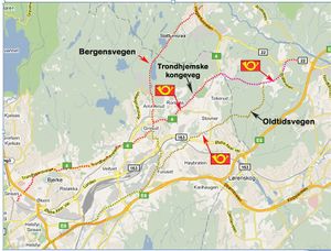 - ↑ Kongeveg eller i dagligtale gjerne kongsveg, kjem vanlegare i bruk i andre halvdel av 1700-talet. Formelt går det ut av bruk i 1824 med veglova, men i folkemålet er det vanleg brukt fram til midten av 1950-talet.