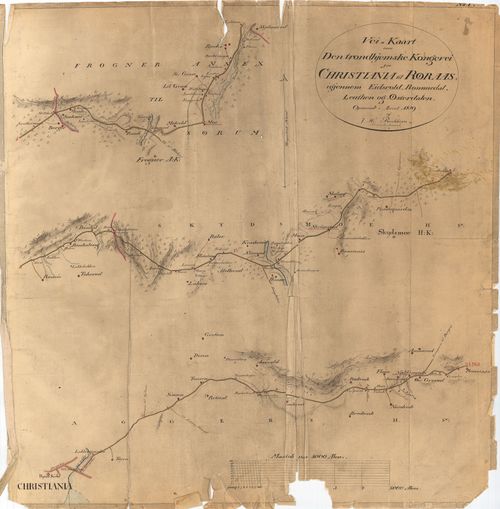 Den viste kartskissen over festningsanlegg og viktige militære veier fra første del av 1700-tallet er en av de tidligste nedtegnelser om hovedveiene på Romerike. Det er verdt å merke seg årstallet 1716 - det var da Karl XIIs gjennomførte sitt hærtog via Romerike mot Akershus festning. Listen over kartets veinavn gjentas her med supplerende kommentarer, regnet fra nord: