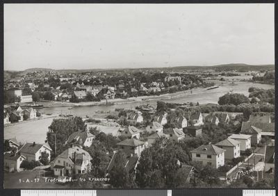 Bebyggelse på Kråkerøy med Fredrikstad i bakgrunnen.