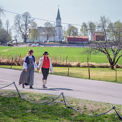 Kråkstadveien med Kråkstad kirke i bakgrunnen en vakker vårdag.