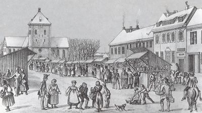 De dagene markedet sto på, flyttet byens egne handelsmenn en del av salget sitt ut på torget. I tillegg solgte tilreisende bønder sine ting: det var all slags matvarer som kjøtt og ost i tillegg til egenproduserte møbler, kjøkkenredskaper, tøy og klær [5]. For dem som kom mest for det sosiale aspektet ved markedsdagene, for å "gå markensgang" som det ble kalt, ble det solgt brennevin og honningkaker.