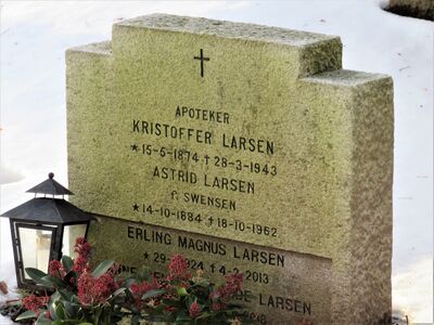 Kristoffer Larsen er gravlagt i familiegrav på Bryn kirkegård i Bærum. Tittelen Apoteker er benyttet på gravminnet.