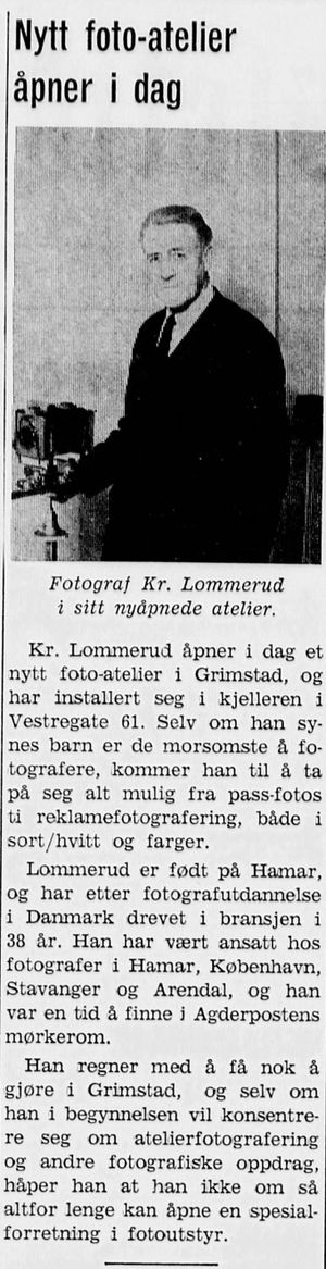 14. mai 1966 annonserer han i Grimstad adressetidende at konfirmantbildene kan hentes i Batteriveien 10 på Biodden.[6] Våren 1968 annonserer han som "fotograf Lommerud, "Ruffen"."[7] I lokalvisen 17/4 1968 noteres det at "Kr. Lommerud åpner i dag nytt fotoatelier i Grimstad og har installert seg i kjelleren i Storgaten 61."[8] I august 1968 annonserer Lommerud at han flytter til Løkkestredet 5.[9]