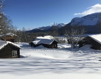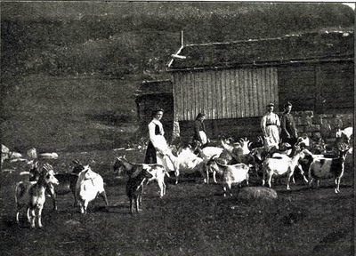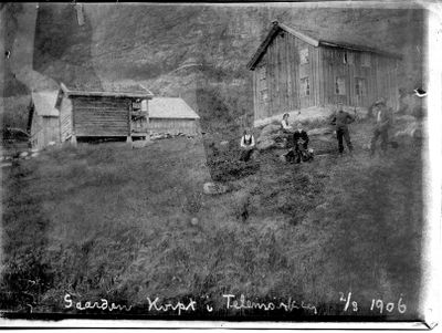 Kvipt omlag 1910, bygninga i bakgrunnen er det gamle eldhuset frå 1500 talet, med påbygg som var geitemeieri. Bilete av Bendik Taraldlien.