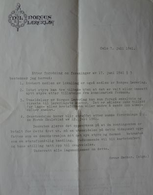 Jeg finner ikke å kunne medvirke til en oppdragelse av Norges ungdom etter de linjer som er satt opp for NS’ ungdomstjeneste, da dette strider mot min samvittighet. Da et medlemskap i Norges lærersamband etter landslederens uttalelser bl.a. pålegger meg forpliktelse til en slik oppdragelse, og det dessuten stiller andre krav som strider mot mine tilsettingsvilkår, finner jeg å burde meddele at jeg ikke kan betrakte meg som medlem av lærersambandet.